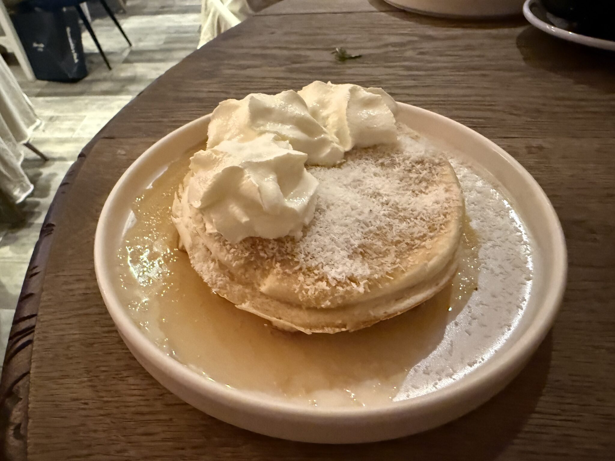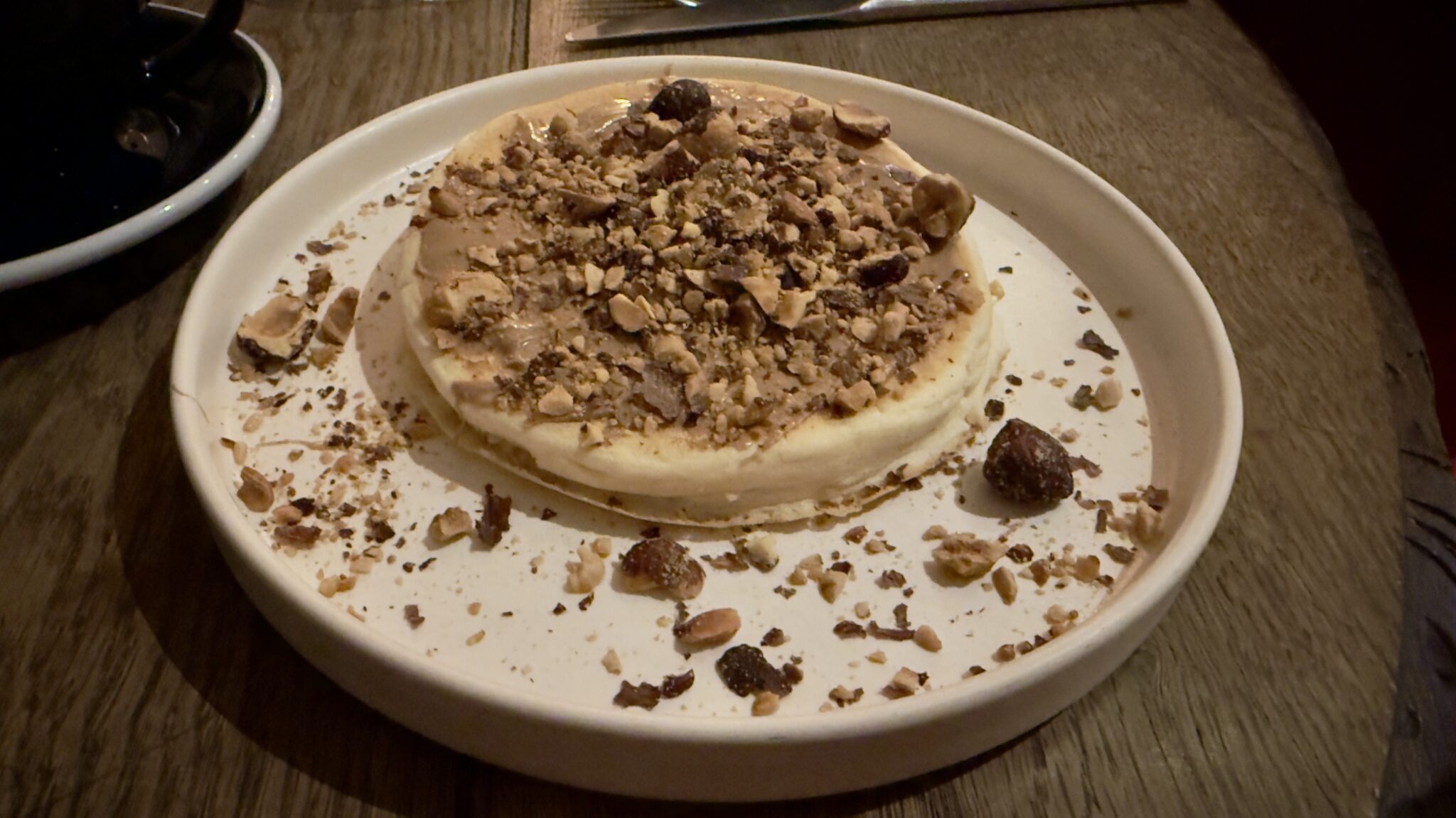 Dans les pancakes sucrés, il y a un seul pancake. Franchement ça suffit amplement parce que, même s’ils sont très bons aussi, je vous avoue que j’ai eu du mal à le finir tellement j’avais le ventre plein des plats précédents.